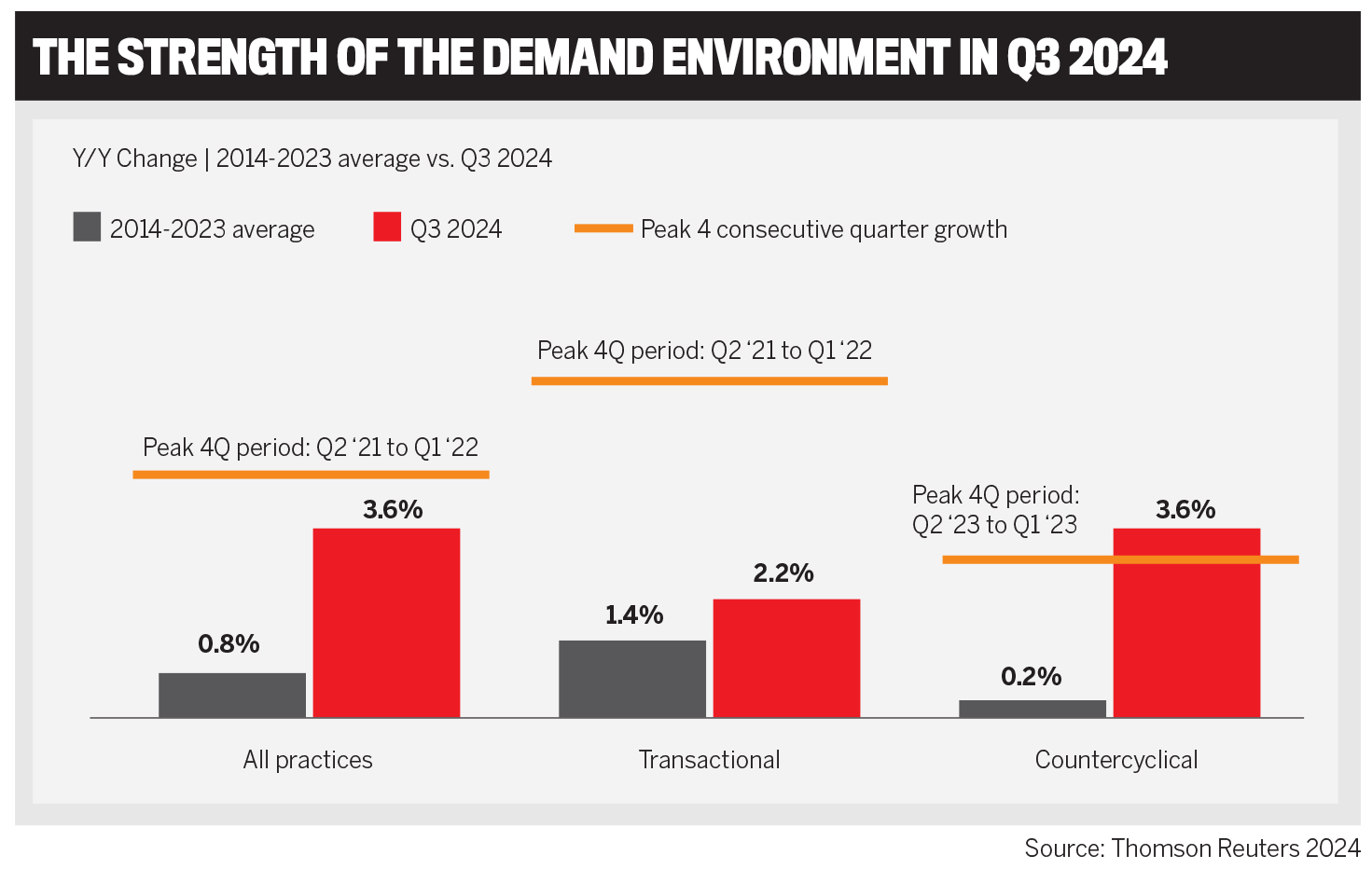 This was led by the countercyclical practices of litigation, up 4 percent, followed by labour and employment, up 2.9 percent, compared to Q3 2023. Notably, the first two quarters of 2024 showed signs of a slowdown here, yet in Q3, demand hit its strongest growth pace in more than a year.